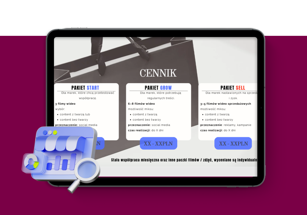 Edytujesz stronę pod siebie a klienci mogą zobaczyć Twoją ofertę, cennik i portfolio w jednym miejscu, a Ty pozyskujesz zlecenia jednorazowe lub stałe współprace – z pokazywaniem twarzy lub bez.