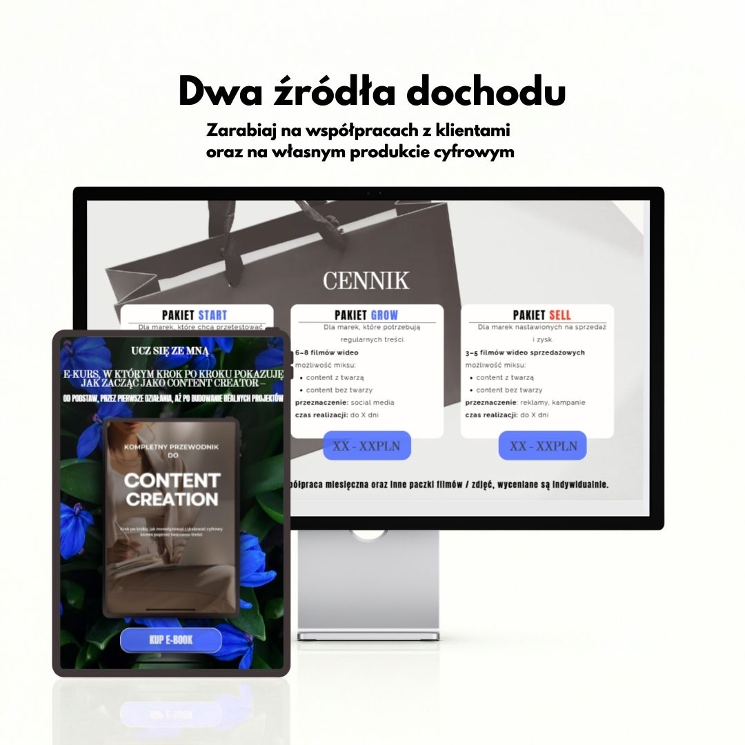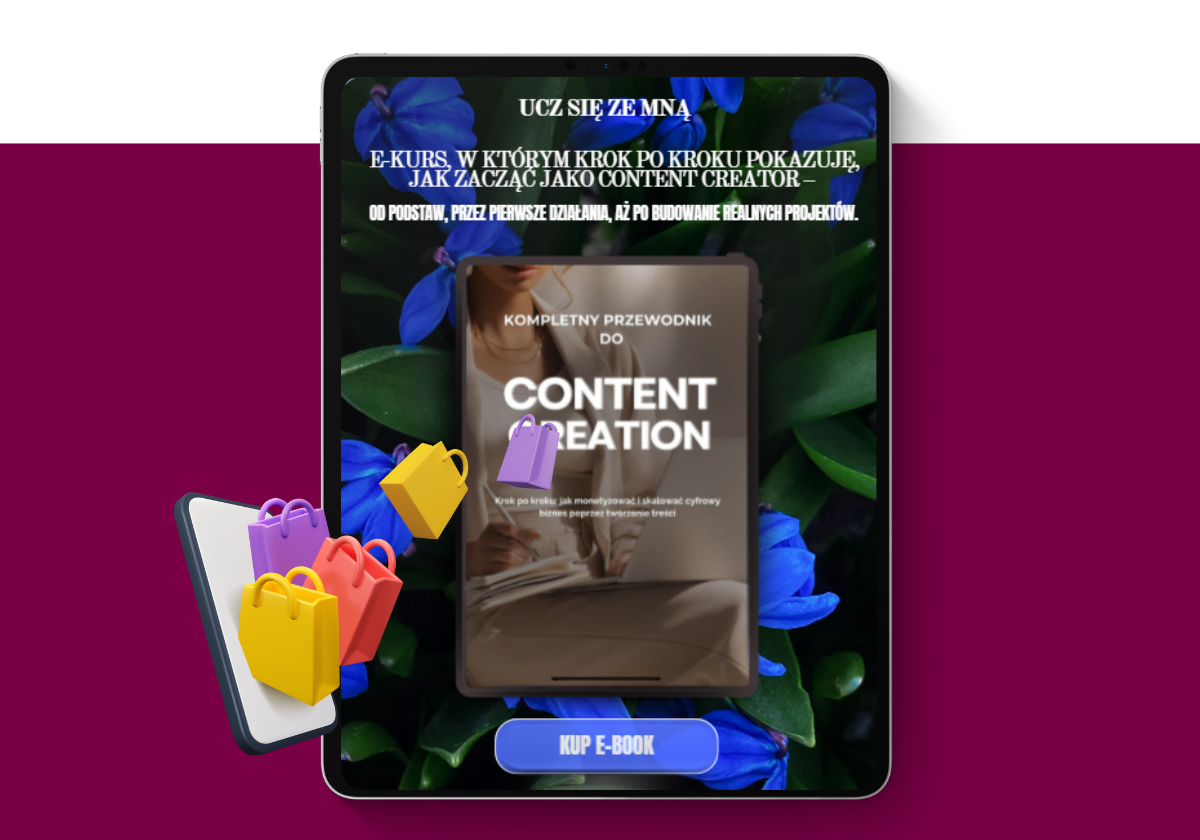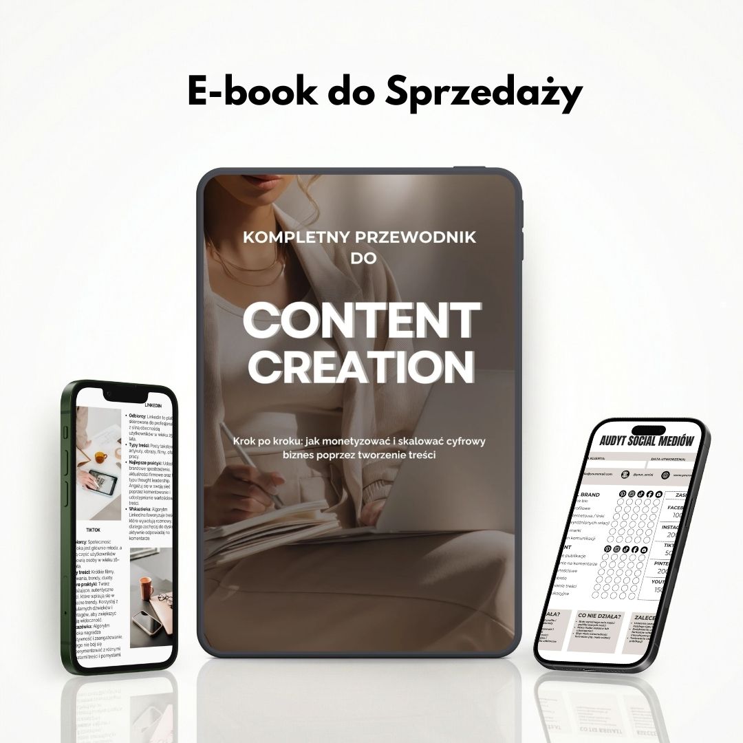 Otrzymujesz gotowy e-book „Przewodnik po Content Creation”, który możesz sprzedawać jako własny produkt cyfrowy.